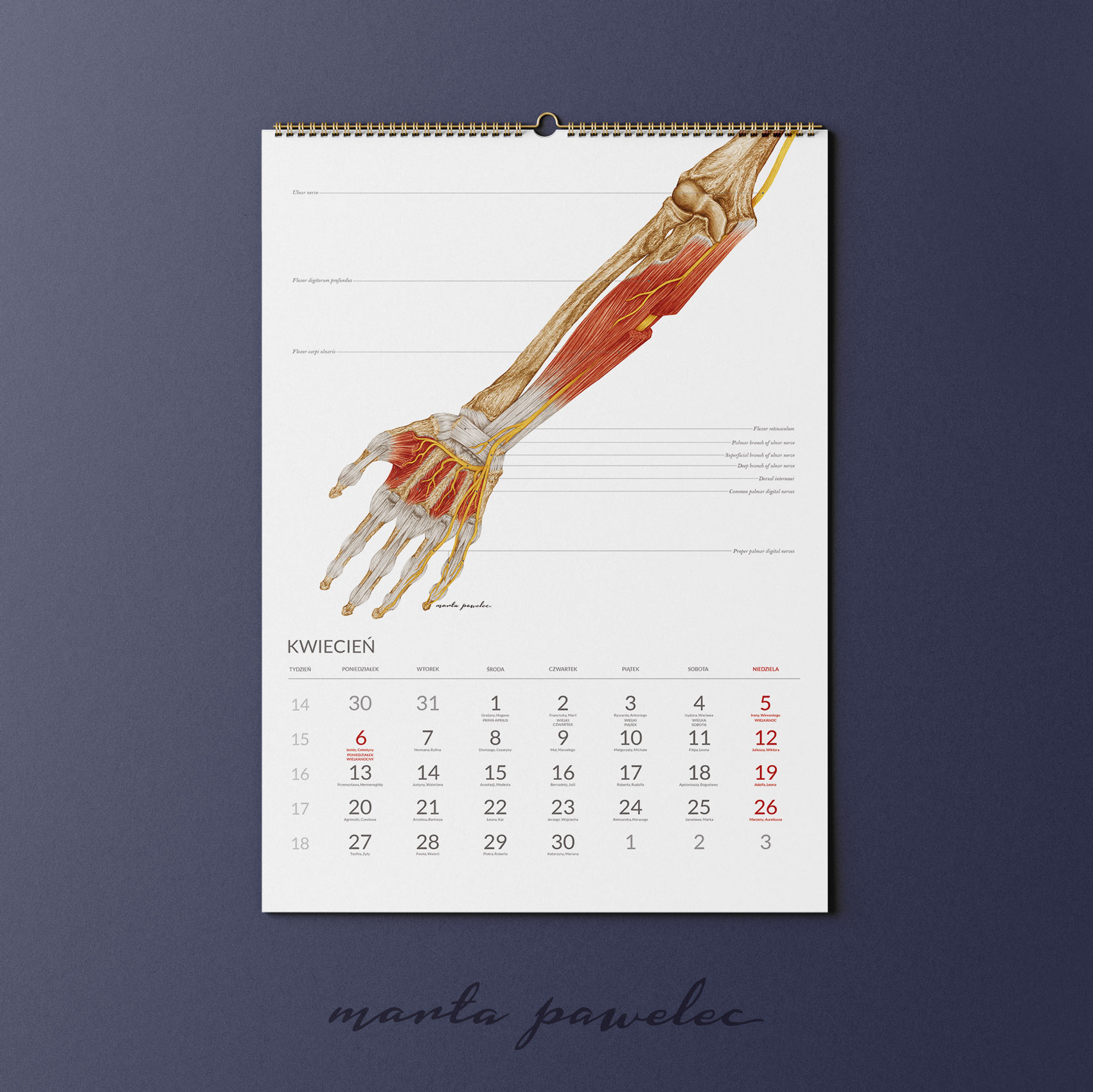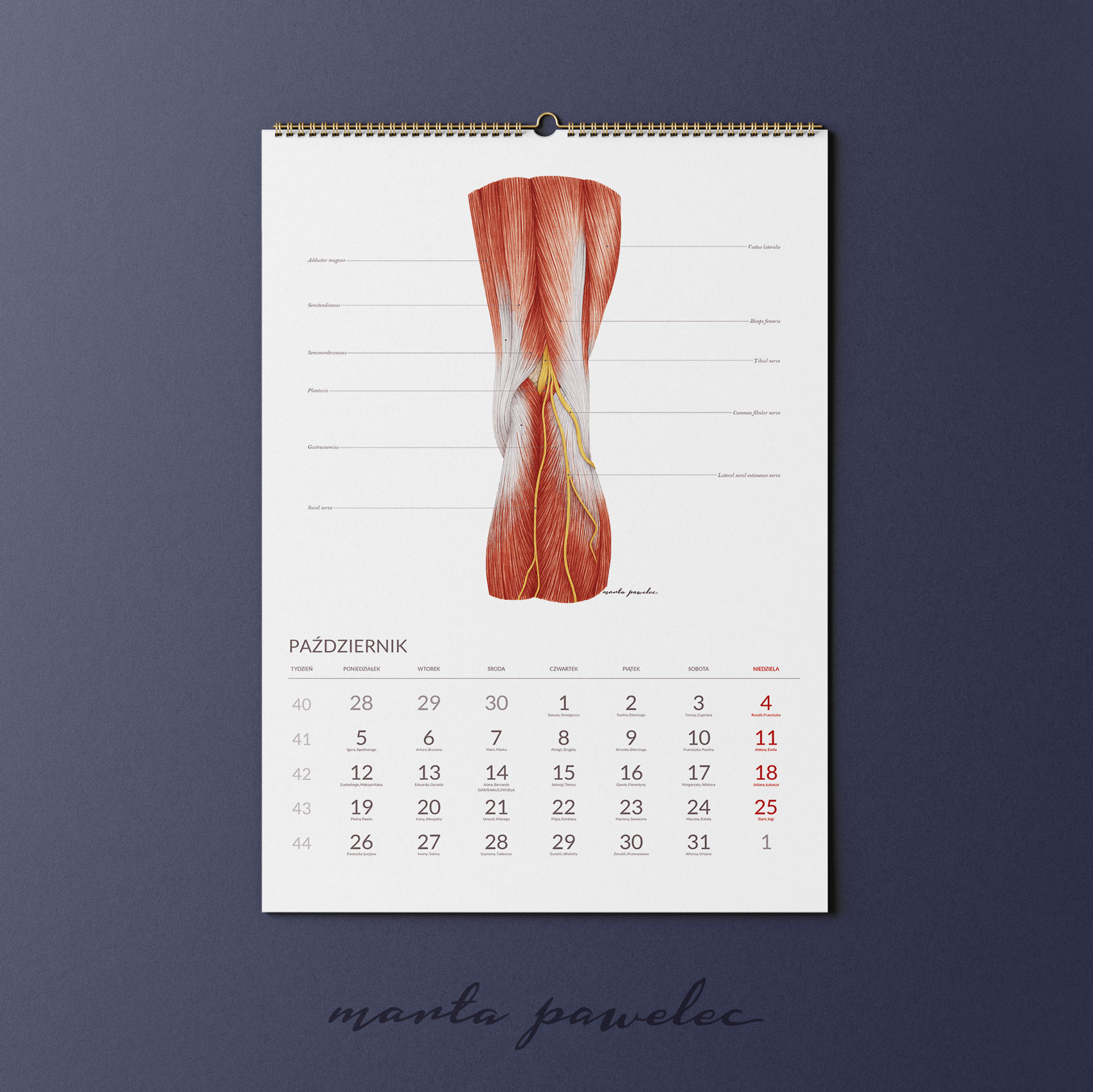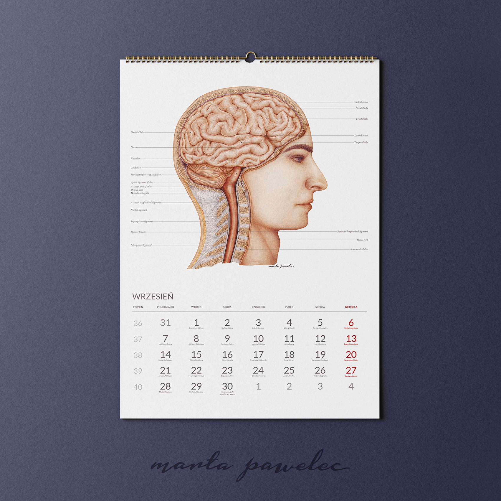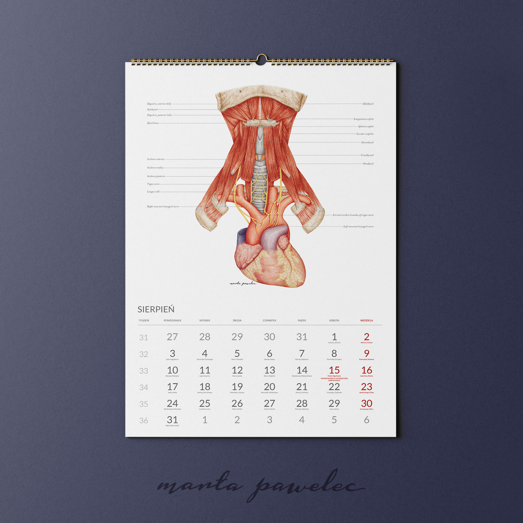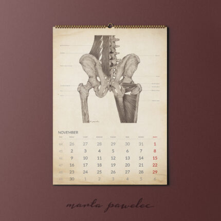 Każdy miesiąc 2026 roku zdobi ręcznie wykonana ilustracja anatomiczna, opracowana zgodnie z aktualną wiedzą medyczną i zasadami ilustracji naukowej. Obrazy przedstawiają struktury ludzkiego ciała z pełną precyzją, zawierają podpisy w języku angielskim. Dzięki temu kalendarz pełni zarówno funkcję edukacyjną, jak i estetyczną.