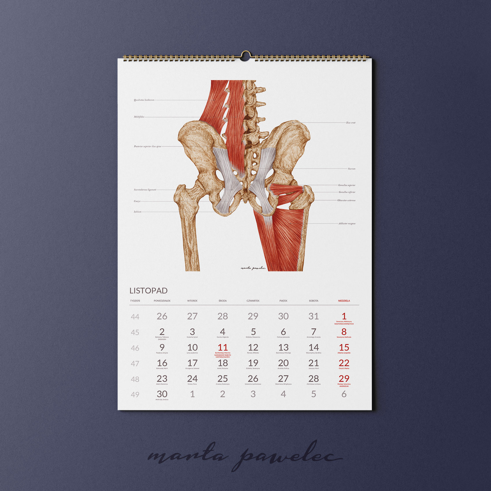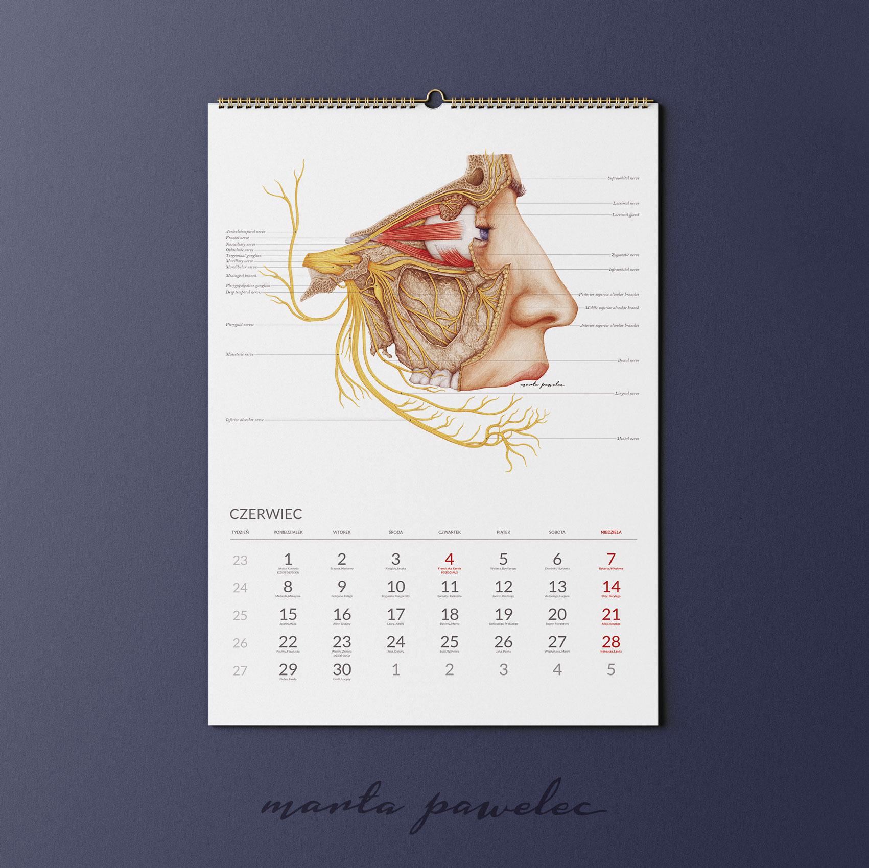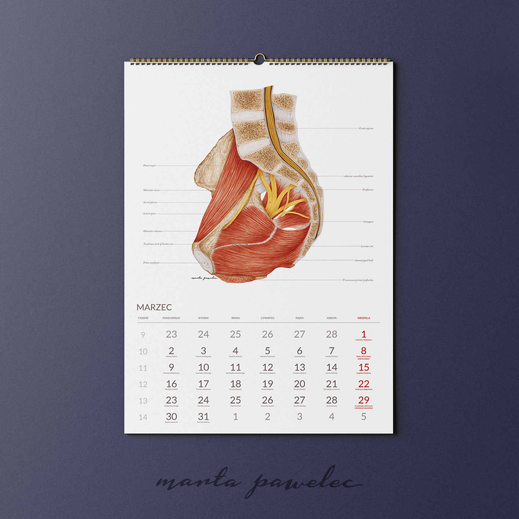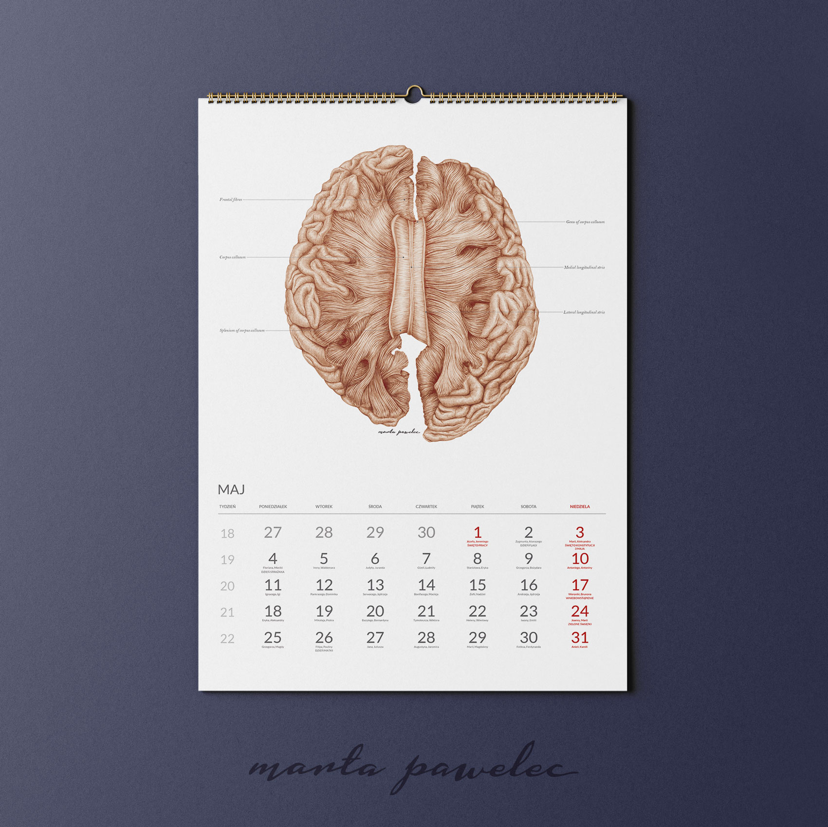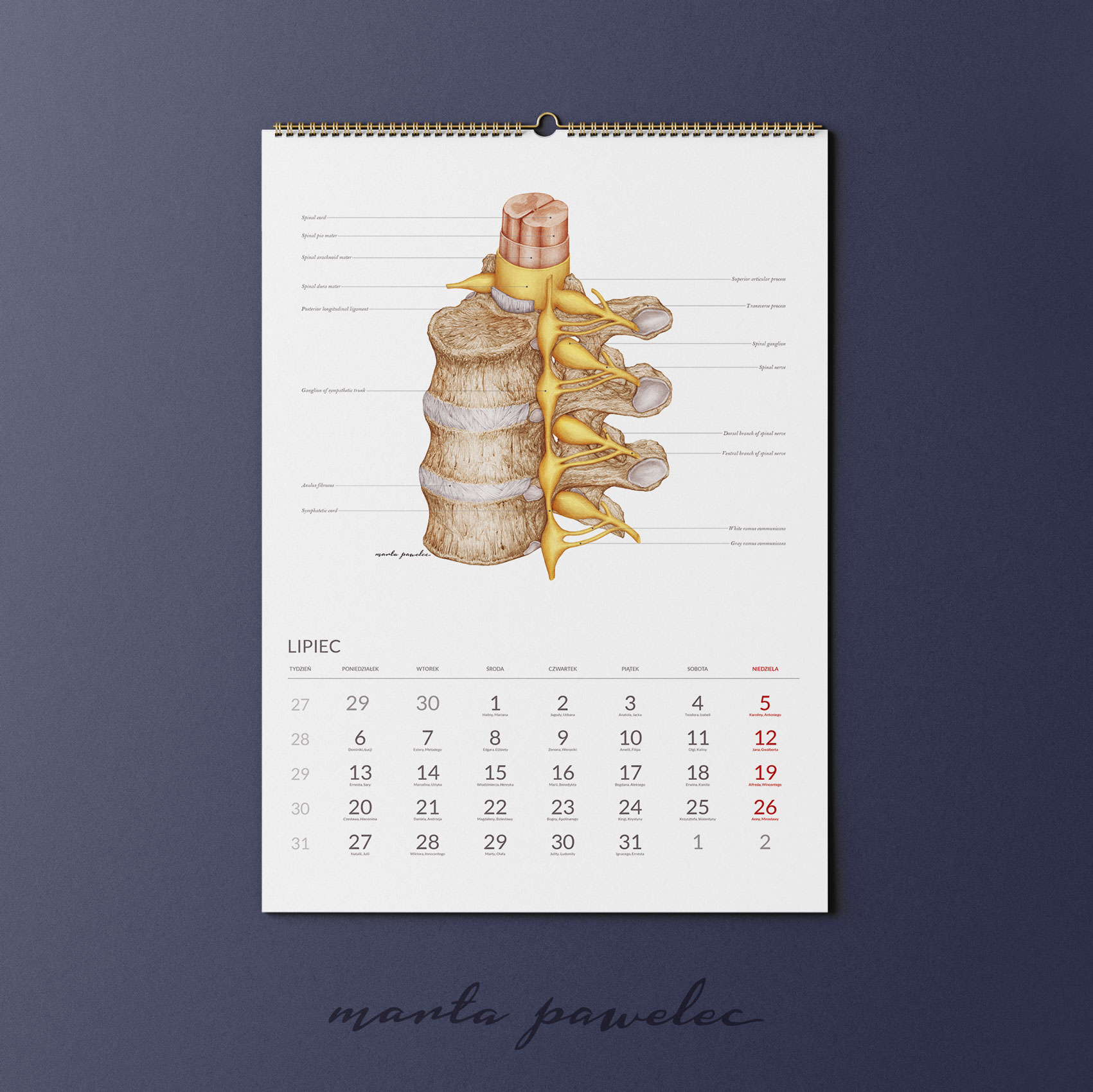 Każdy miesiąc 2026 roku zdobi ręcznie wykonana ilustracja anatomiczna, opracowana zgodnie z aktualną wiedzą medyczną i zasadami ilustracji naukowej. Obrazy przedstawiają struktury ludzkiego ciała z pełną precyzją, zawierają podpisy w języku angielskim. Dzięki temu kalendarz pełni zarówno funkcję edukacyjną, jak i estetyczną.