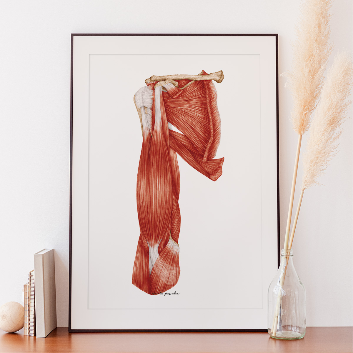 Plakat anatomiczny „Mięśnie kończyny górnej” to szczegółowa ilustracja pokazująca mięśnie obręczy barkowej, ramienia i przedramienia. Grafika skupia się na realistycznym przedstawieniu struktur, bez nakładania opisów, co zapewnia przejrzystość i estetykę.