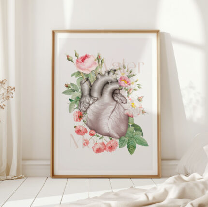 Plakat „Serce w Kwiatach” to wyjątkowe połączenie precyzyjnej ilustracji anatomicznej z wyrazistym, kwiatowym tłem. Motyw serca osadzonego wśród roślinnych form nadaje pracy symboliczny wymiar, ponadto łączy naukę, życie i emocje w jednej, harmonijnej kompozycji.