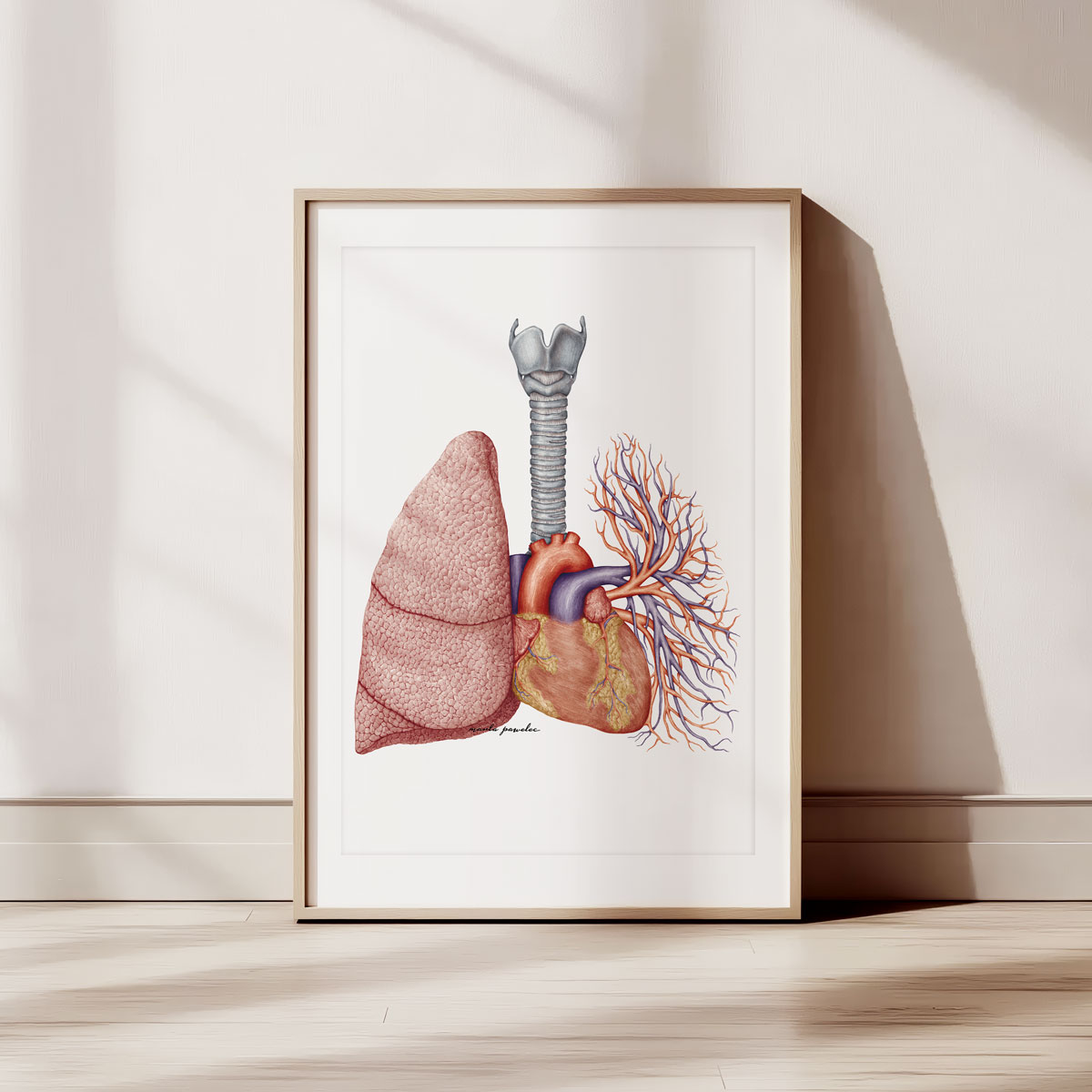 Ilustracja została wykonana przez profesjonalną ilustratorkę medyczną, która ma ponad 10-letnie doświadczenie w tworzeniu anatomicznych grafik. Zgodnie z aktualnym stanem wiedzy medycznej, obraz jest anatomicznie poprawny i dokładny, co zapewnia jego wysoką jakość i wartość edukacyjną. Dzięki tej ilustracji, zarówno studenci, jak i profesjonaliści mogą lepiej zrozumieć złożoną budowę układu oddechowo-krążeniowego.
